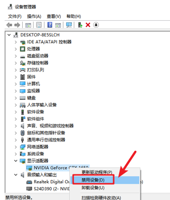 6.進(jìn)入設(shè)備管理器后,點(diǎn)開(kāi)【顯示適配器】,然后選中獨(dú)立顯卡,右擊,選擇【禁用設(shè)備】,最后重啟電腦。