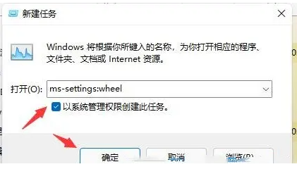 2.在彈出的窗口輸入:ms-settings:wheel,勾選“以系統(tǒng)管理權(quán)限創(chuàng)建此任務(wù)”,然后點(diǎn)擊“確定”。