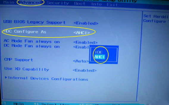 2.進入BIOS后,按下鍵盤上的左右方向鍵,切換到“Advanced”上面,接著按下鍵盤上的上下方向鍵,選中“HDC Configure AS”然后回車,最后再按鍵盤上的左右方向鍵,選中“AHCI”選項,回車,并單擊“F10”保存,最后退出就可以了。
