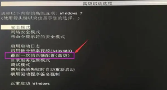 重啟電腦,多次按下鍵盤的F8鍵,然后電腦就彈出了“高級啟動選項”,接著我們需要找到“最后一次的正確配置”選項,并按下鍵盤回車鍵進入,這樣就可以進入系統。