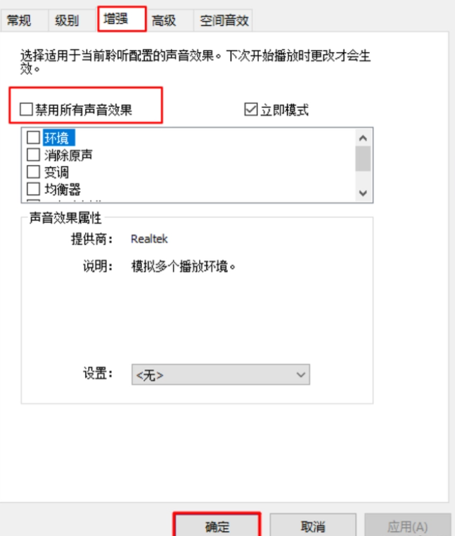 4.把上方切換至“增強(qiáng)”菜單欄,取消勾選“禁用所有聲音效果”,再點(diǎn)擊“確定”按鈕即可。