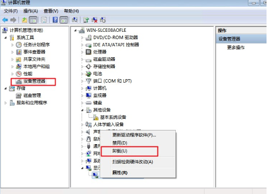 3.進(jìn)入“管理”界面,依次點擊“設(shè)備管理器”-“顯示適配器”,右擊“顯卡驅(qū)動”選擇“卸載”。最后勾選“刪除此設(shè)備的驅(qū)動程序軟件”,按確定鍵。
