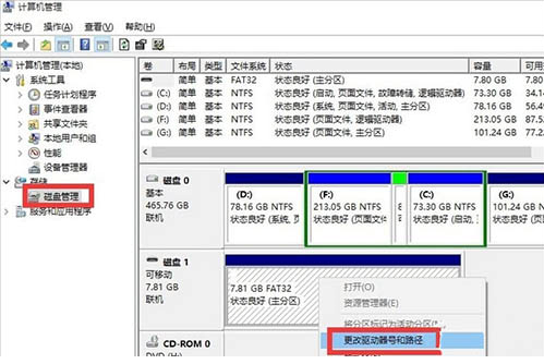 1.右擊選擇“管理”,進入后,選擇左側(cè)的“磁盤管理”,在右側(cè)右擊可移動硬盤,選擇“更改驅(qū)動器和盤符”。