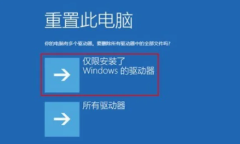 4.選擇“僅限安裝了windows的驅(qū)動(dòng)器”,因?yàn)椤八序?qū)動(dòng)器”會(huì)對(duì)電腦中的許多數(shù)據(jù)進(jìn)行刪除重置,難以恢復(fù),所以不要選錯(cuò)。之后耐心等待電腦重置完成即可。
