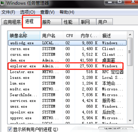 2.點(diǎn)擊“進(jìn)程”,找到“explorer.exe”。