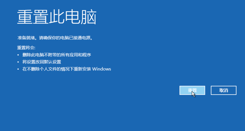 3.確認充值信息,點擊重置即可。接著電腦就會自動啟動并進行系統初始化,所花時間會比較多,耐心等待完成即可。
