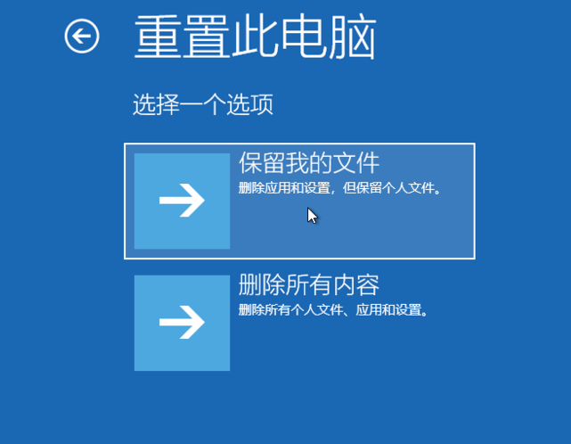 2.選擇“保留我的文件”,如果確定系統沒有什么重要的數據了,那可以選擇“刪除所有內容”進行重置。