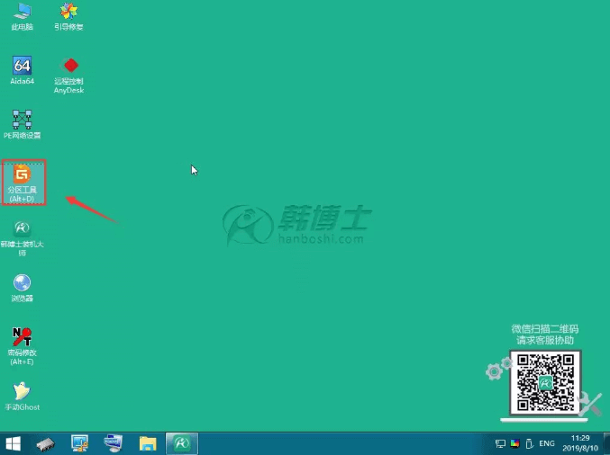 8.進入PE系統后,不要急于打開韓博士裝機工具,首先打開桌面上的分區工具;一般新的SSD是未分區的,需要使用分區工具進行分區;