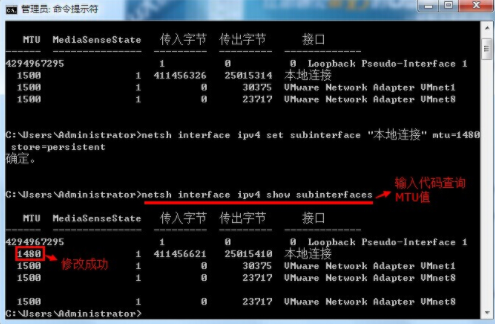 2.開始在界面中輸入以下命令查詢當前電腦的MTU值: