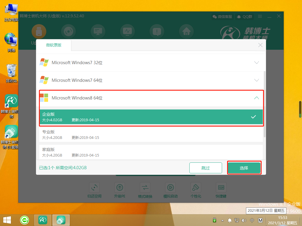 3. 韓博士進入PE系統(tǒng)后,點擊U盤里已經下載好的win 8系統(tǒng)文件進行安裝。