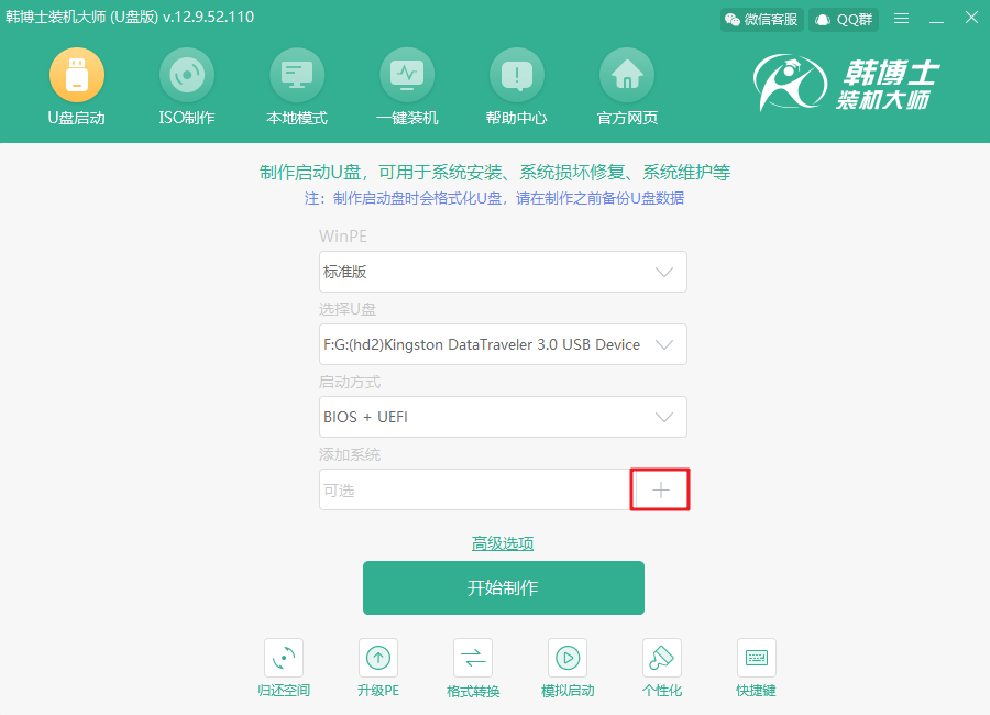 1.打開韓博士裝機大師(U盤版),點擊界面中的“+”,選擇合適的win11系統。