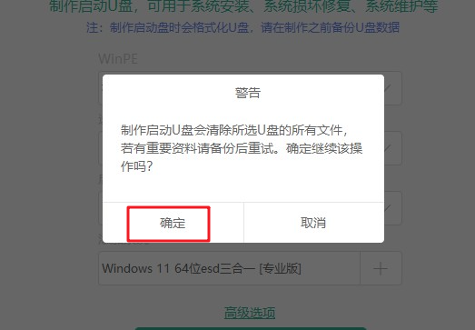 3.制作的時候會格式化U盤里的數據,所以要提前備份好U盤里的重要的數據文件,這里選擇“確定”。